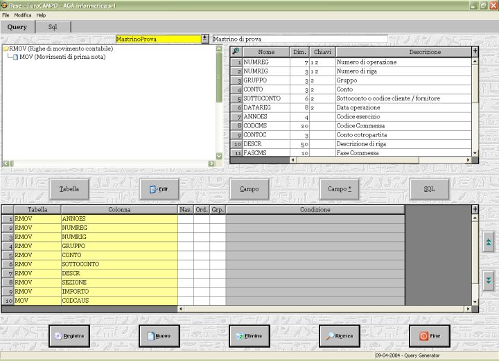 | Campo | Aggiunge il campo correntemente selezionato alla lista dei campi da visualizzare nella query. |