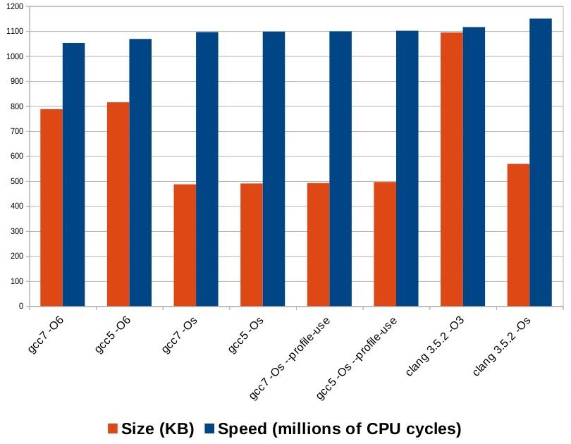 5. The only significant design decision that developers need to make is whether to use -Os (optimize for size) or -O6 (optimize for speed). The -O6 setting makes binaries that run about 2% or 3% faster, but which are also 66% larger. The performance here is measured by counting CPU cycles using cachegrind. I-cache misses are not considered in the analysis. If I-cache misses are considered, builds with -O6 might not be any faster than builds with -Os.